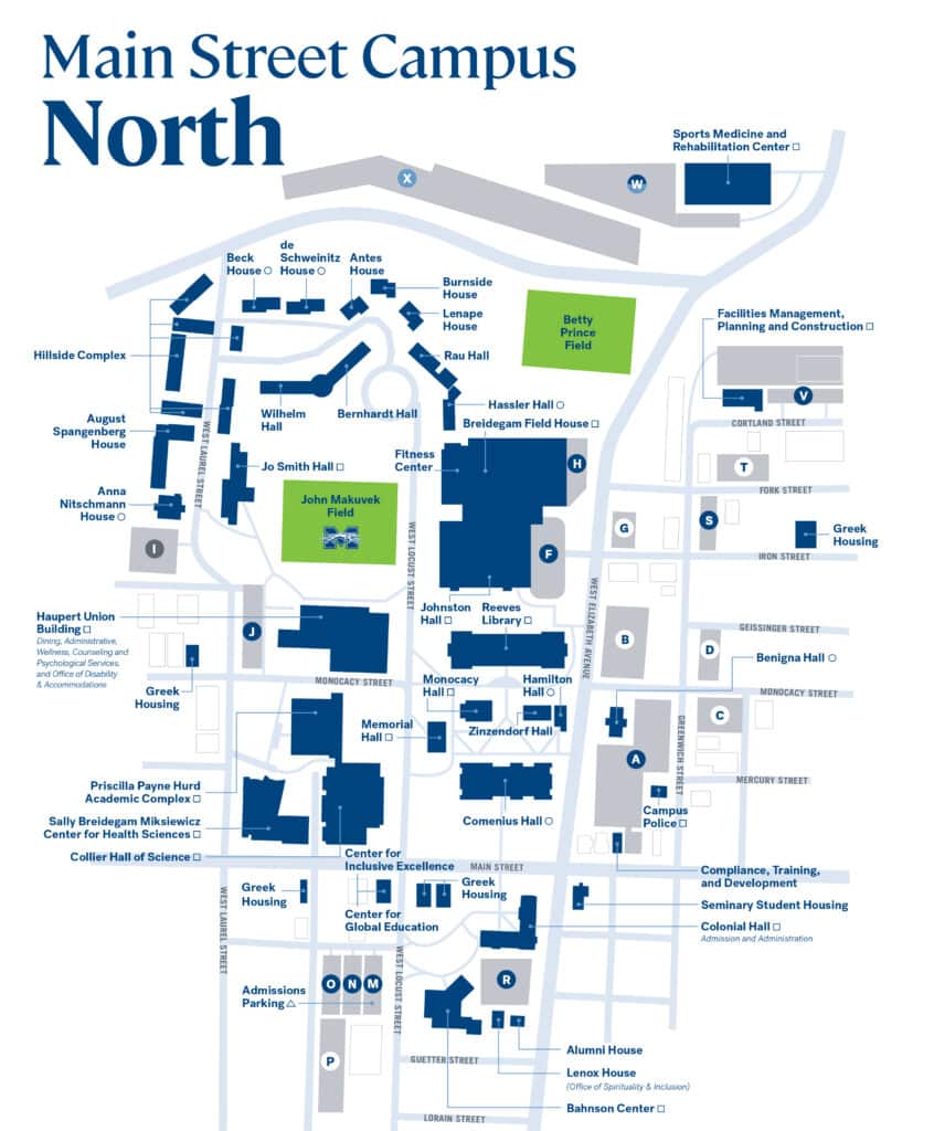- From the “Campus Maps” page: The Main Street (North) Campus is located within eight blocks of a residential area and downtown core. The South (Priscilla Payne Hurd) Campus sits roughly eight blocks south, in the heart of the Bethlehem Historic District.