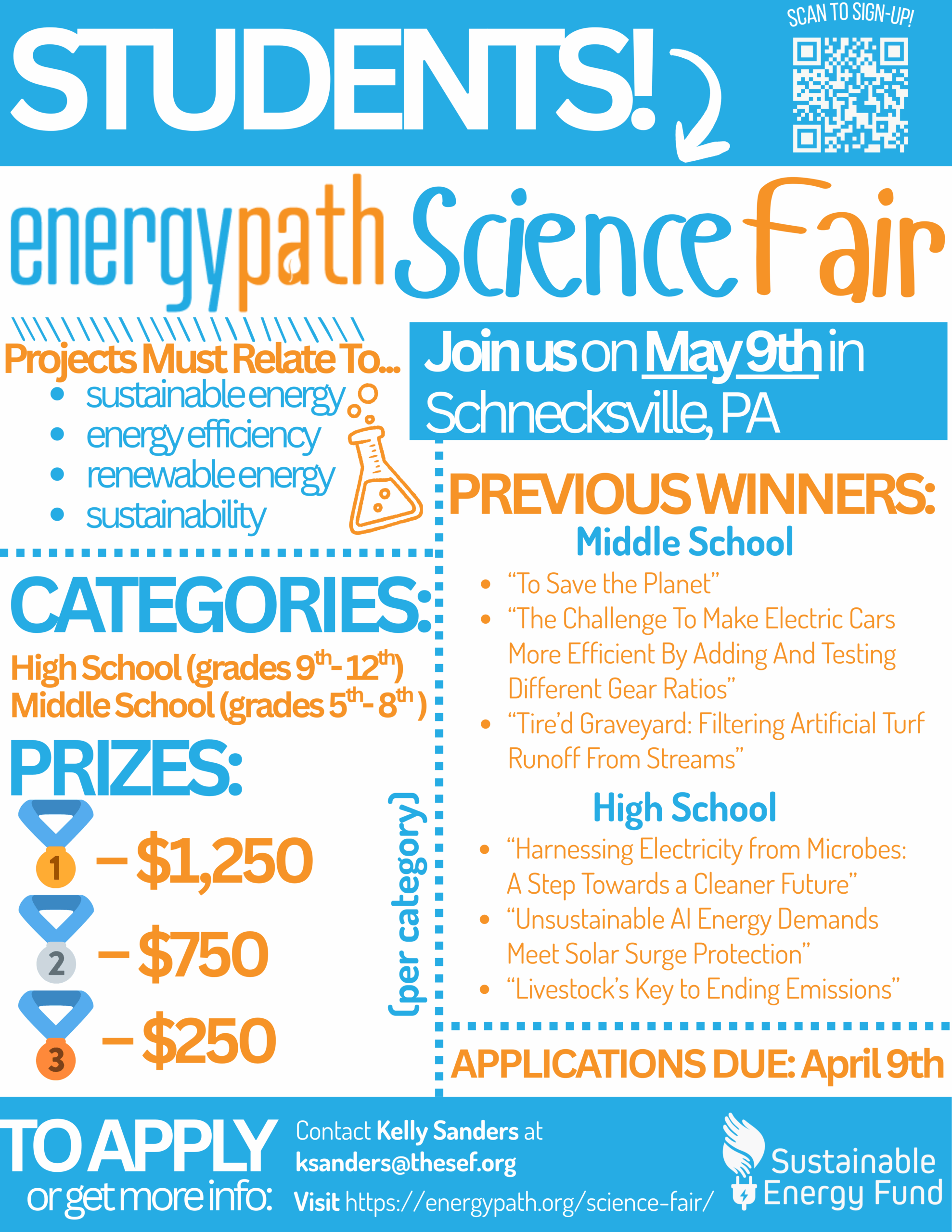 » Read MoreAre you passionate about energy efficiency, energy conservation, renewable energy, or other topics relating to sustainable energy? Then you should participate in our Sustainable Energy Science Fair! Held in conjunction with the annual Energypath conference, the Sustainable Energy Fund Science Fair allows Middle and High School students to showcase their projects relating to sustainable energy and compete for cash prizes of up to $1,250. Winners are invited to attend the Energypath conference on July 16tg, 2026 at Moravian University during the Energypath Professional Conference, where students can network with professionals and experts in the energy industry, sit in on sessions led by experts in their fields, and more!